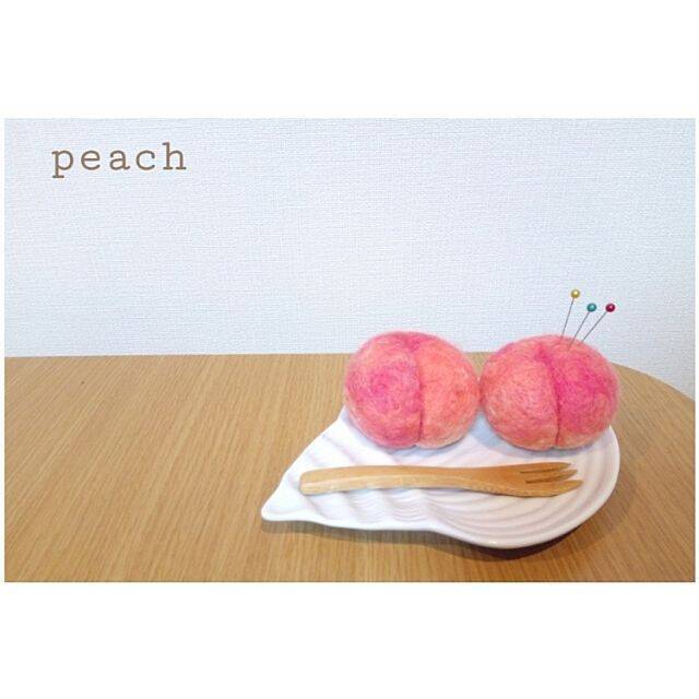 お皿の上に、2つ並んだ桃の果実。実はchobicoさんが羊毛フェルトで作ったピンクッションなんです。愛らしいフォルムと色合いで、食べたくなっちゃいますよね。桃の果実の繊細なカラーリングも表現されていて、オブジェとして飾りたくなりそうです。