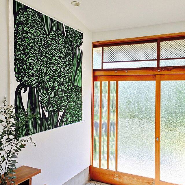 ガラス戸を通して光が差し込む、明るいデザインの玄関です。幾何学的な組子細工と模様ガラスのレトロな引き戸が、和モダンですね。ユーザーさんはマリメッコのタペストリーを飾っています。グリーンの色味が心地良く、引き戸とマッチしていますね。
