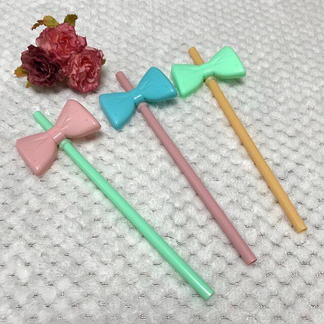パステルカラーのストローは、ガーリーな雰囲気たっぷりのアイテム。大きめのリボンをつけたストローは、このまま飾ってディスプレイしたくなるようなルックスです。子どものころを思い出す懐かしさにほっとします。