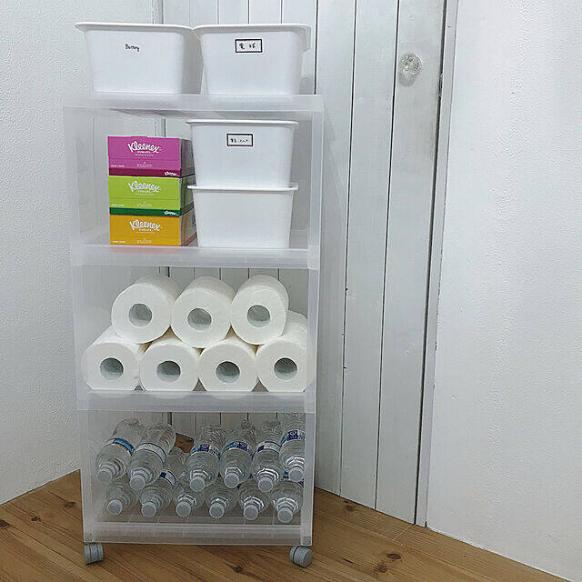 階段下の収納スペースに、「ポリプロピレン組立式ワゴン・キャスター付・3段」を使って、ストック収納をされています。ペットボトルやトイレットペーパーなどかさばるものが、スッキリと収納できていますね。ペットボトルが重そうですが、キャスター付きなので、移動が楽そうです。