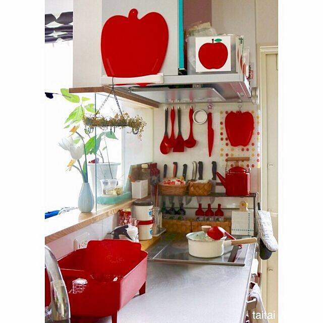 赤が好きなtaitaiさん。家の中での自分の場所であるキッチンは好きな色で統一して、家事のやる気をアップさせているそうです。好きな色で囲まれると気分も上がりますし、赤色の効果でますます元気になって家事もはかどりそうですね。リンゴモチーフもキャッチーなポイントです。
