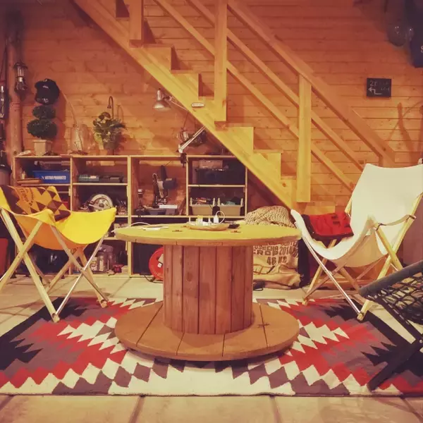 hiroyakizawaさんのご自宅は、大きなダイニングテーブルの周りにさまざまな種類のアウトドアチェアが並んでいます。コンクリート打ちっぱなしのお部屋がスタイリッシュで、山小屋を秘密基地にしたかのような雰囲気ですね。仲良しの友達を呼んで、映画鑑賞を楽しみたい気分です。