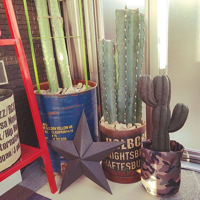 Lukiさんは、青地に白いロゴ入りのリメイク缶を、サボテン型ドアストッパーの鉢代わりにしていらっしゃいます。海を思わせる鮮やかな青が、カリフォルニアスタイルにぴったりですね。白が基調のナチュラル・シンプルなお部屋に映える、爽やかなアクセントになっています。