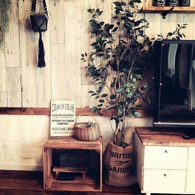 ナチュラルクールなお部屋に、大きなニトリのフェイクグリーンが印象的です。プランターは麻袋でカバーし、グリーンのインテリア性をパワーアップさせています。深い緑とアースカラーの組み合わせは、シックな中に爽やかさを感じますね。少し大きめだったという麻袋は、折り曲げて安全ピンを使い調整しているそうです。