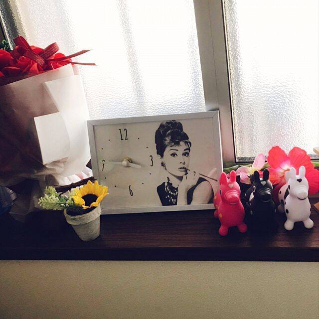 アイアン時計に憧れているというparuさんは、右上に見える大きな時計をDIYされました。90cmの発泡スチロールに大きなコンパスで円を描いて、カッターでカットされたそうです。軽くて壁にも掛けられる、とても良いアイデアですね。