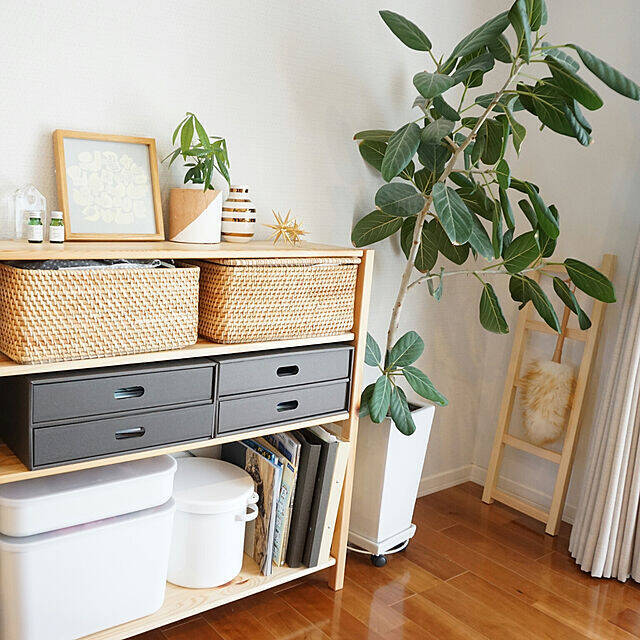 yumihoさんのご自宅では、無印良品のラタンボックスをサイズ違いで使っていて、ふたを付けることで重ねて見せる収納を楽しんでいます。同じサイズ同士でも重ねて使えますが、サイズ違いで並べるのも素敵ですね。周りに置かれた観葉植物が、ナチュラルさを演出していてお見事です。
