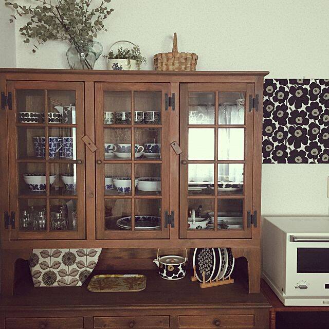 こちらの実例では、アラビアのヴィンテージ食器がロールストランドやマリメッコの食器などとともに、食器棚に並んでいます。ガラス扉の食器棚を使うことで、埃などから器を守りつつ、その柄を楽しむことができるのがいいですね。趣きのある食器棚に、落ち着いたブルーやブラウンの柄が入った食器たちが似合っています。