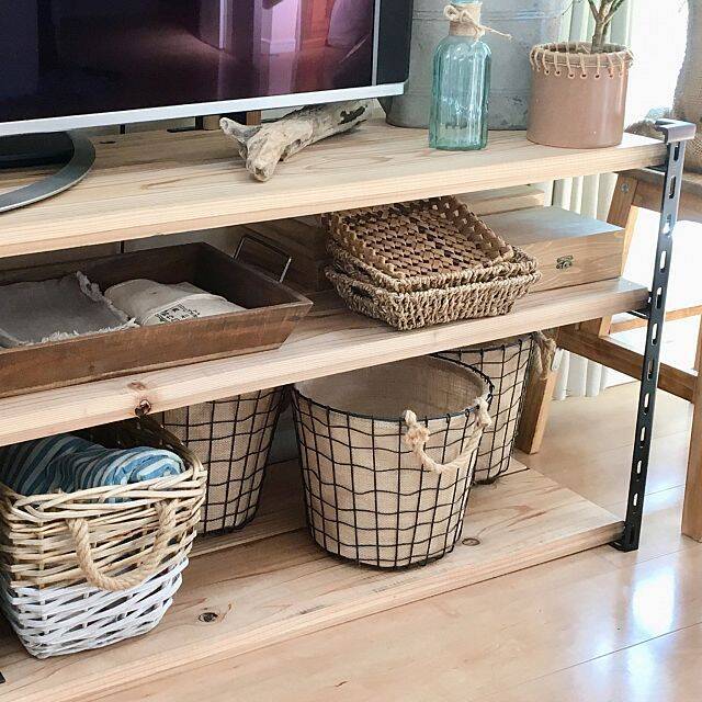 ナチュラルなかごや木箱を使い、テレビ台をまるでセレクトショップのような雰囲気に仕上げているユーザーさん。こちらのかごには、お掃除用品やカメラなどが入っているそうです。空のかごを準備しておくと、いざというときの一時置き場としても使えて便利です。