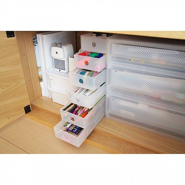 お子さんが良く使う文房具類を、無印良品のアイテムを使って整理整頓している実例です。鉛筆削りなど一緒に使うものも収納しておくと、お勉強も遊びもスムーズに始められそう。シンプルなカラーでまとめられており、お客様が来ても堂々と見せることができます。
