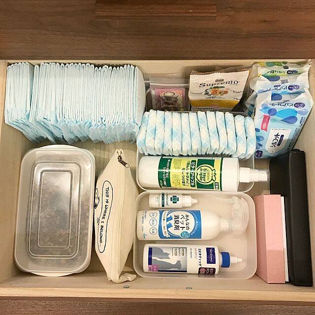 愛犬のためのグッズを、テレビ台に収納している実例です。ボトル類は横向きにするとお目当てのものがすぐに見つけられて便利ですね。ポーチの中にはコットンが入っているそうです。
