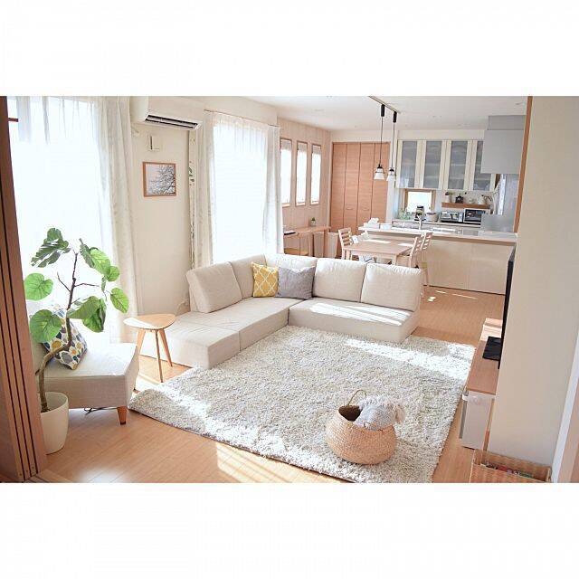 ナチュラルインテリアの、asukaさんのリビングです。真ん中には、脚を外した白いローソファをL字型に置いて視線を下げた配置。お部屋全体をホワイトで明るく見せつつ、彩りのあるアイテムで居心地のよさそうな雰囲気に仕上げています。