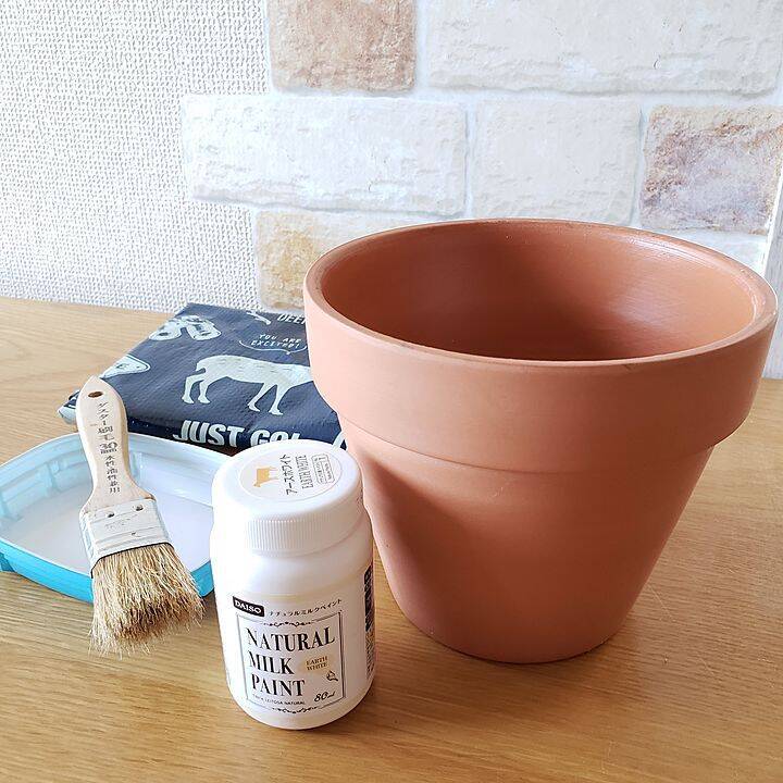素焼きの鉢【ダイソー 売場:グリーン/ガーデニング】ナチュラルミルクペイント アースホワイト【ダイソー 売場:DIY材(スノコ、工具、フック等)】英字折り紙【ダイソー 売場:オフィス/文具】麻紐【ダイソー 売場:その他】筆【ダイソー 売場:DIY材(スノコ、工具、フック等)】■必要な道具