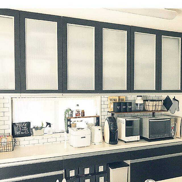 「キッチン収納で使うケースは、ほとんど白か透明です。統一感だけでなく清潔感も出ます。調味料や乾物、レトルト、缶詰などの食品ストックは、背面の戸棚の中なので、できるだけ見やすさや取り出しやすさに配慮した収納にしています。