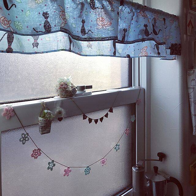 手ぬぐいを使って、カフェカーテンを作られている実例です。ユーザーさんは、キッチンが暗くならないように、手ぬぐいの幅を狭くするという工夫をされたのだそうですよ。窓辺のアクセントとして、ぱっと目を引くカーテンのキュートな柄と、周囲の可愛らしい雑貨の相性も◎です。