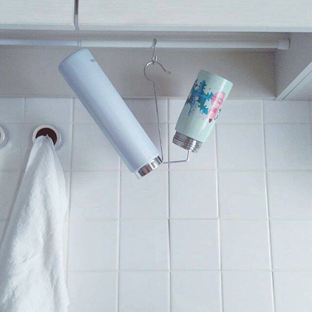 waniwaniさんは、キッチンで水筒を干すのにセリアのシューズハンガーを使っています。ステンレス製でサビにくく、シンプルなデザインで場所を取らずに使えるとのことです。逆さに掛けておけるので、水筒の中もしっかりと乾いてくれそうですね。