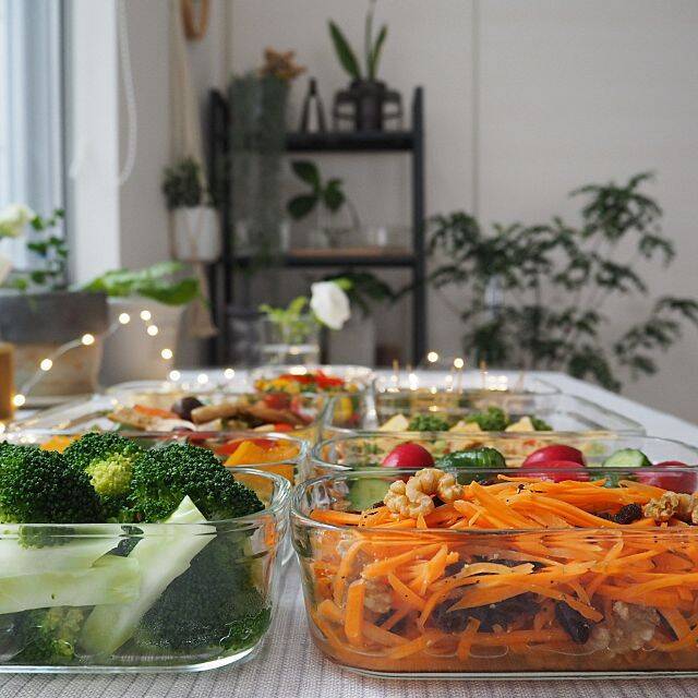 mimiedenさんが作り置きをする際に活用されているのが「iwaki パック&レンジ」耐熱ガラス容器です。塩分や酸に強いガラス製で匂い移りもせず、熱湯消毒ができて衛生的。フタをしたままレンジ使用も可能です。使用していないときはスタッキングでき、収納する際もスッキリとした見た目をキープしてくれます。