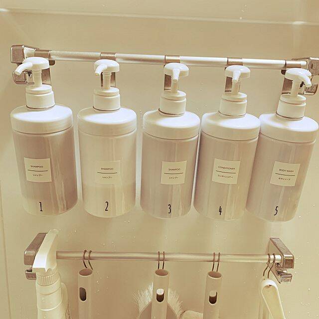 こちらのユーザーさんはボトル用のフックを利用して、ボトルを吊るして収納しています。セリアの詰め替えボトルに統一され、ラベリングをして、中身がわかるようにしています。数字は、お子さんでも中身がわかるようにするためのものだそうです。ボトルを床や棚に置かないことで底のヌメリを気にせず使うことができますね。