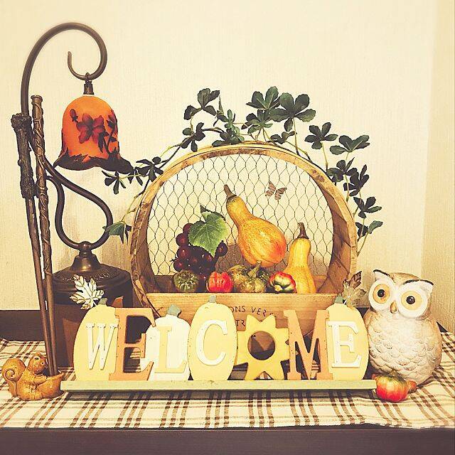こちらは、ruru_chanchakaさん宅の玄関ディスプレイです。かぼちゃ、ぶどうなど実りの秋を連想させる食べ物、そしてリス、ふくろうといった動物が大集合。「WELCOME」の文字も秋風になっています。