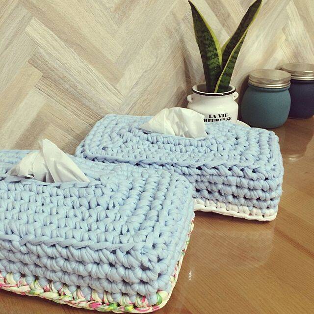 ボックスティッシュのカバーに、ズパゲッティで編んだカバーを付けて爽やかにアレンジしています。ズパゲッティのざっくり感とパステルブルーの組み合わせは、柔らかい雰囲気になって相性抜群ですね。下の方にはポイント的に花柄も使われていて、オリジナリティを感じる作品になっています。