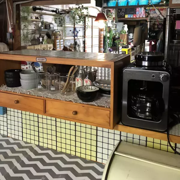 昭和レトロが大好きなvivienne.coco-keiさんのキッチンです。ビーカーやサイダーの瓶、sirocaコーヒーメーカーなどをカッコよくディスプレイされ、古民家カフェのようですね。フリマでGETしたお宝もあるそうで、ワクワクする空間になっています。