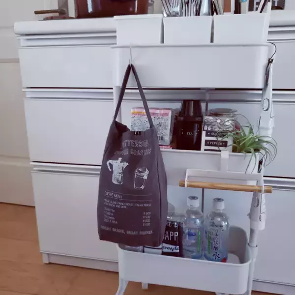 puritan_rさんのトローリーワゴンに掛けられた、カフェのエコバッグのようなグレーのバッグが、セリアのレジ袋ストッカーです。レジ袋ストッカーとは気づかないようなスタイリッシュな見た目ですね。これまでレジ袋は引き出しにしまっていたそうですが、今では見せる収納にしているというのも納得です。