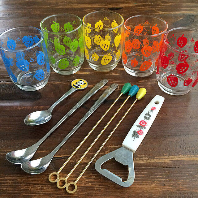 soramameさんが、おばあちゃんからもらったレトロポップなお宝。5色セットのいちごのタンブラー、パンダのスプーンは、昭和の可愛さですね。レトロなロゴで人気のサクラ印のハチミツスプーンは、さりげなく豪華な装飾で、高度成長期の時代を感じさせます。
