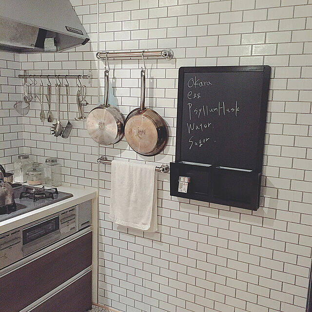 クールでスタイリッシュなステンレス製キッチンツールは、塩系インテリアにぴったり!tsunaさんのようにオールステンレスで統一すると、よりすっきりと美しくまとまります。サブウェイタイルや黒板など、ステンレスと相性のいいアイテムを組み合わせ、生活感のないカフェテイストに仕上がったキッチンですね。
