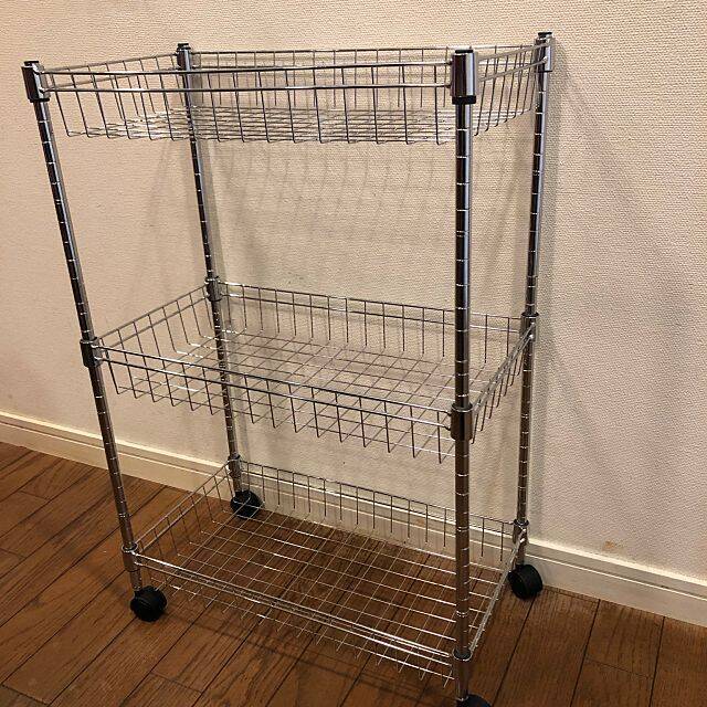 パントリー収納に使おうと、ダイソーのジョイントラックを組み立てたものです。25cm×45cmのバスケット棚3つをポールでつなげています。ポールに延長ポールをつなげて間を広く取っていて、たくさん収納できそうです。キャスターもつけて、出し入れのしやすいラックの出来上がりです。