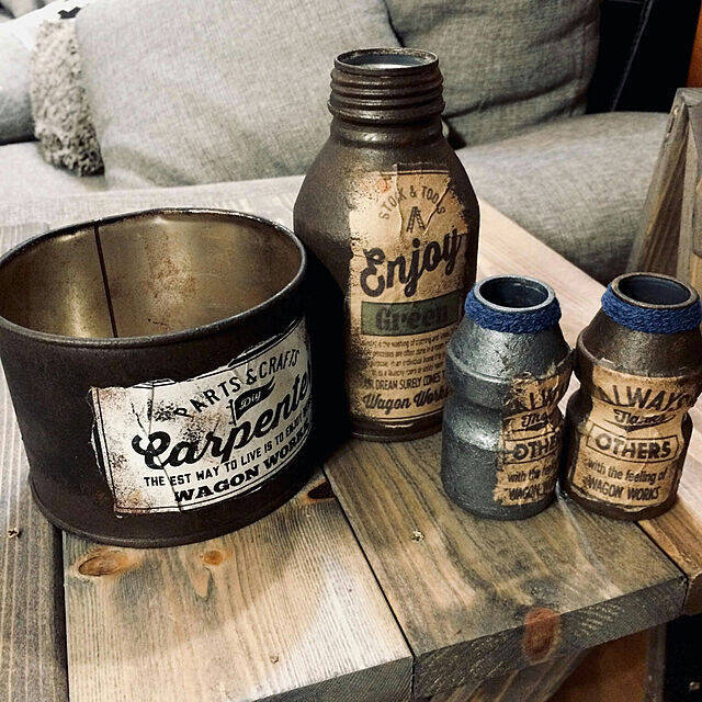 irieriさんは、アイアンペイントで塗装しインダストリアルなリメ缶に仕上げられています。小さなものはヤクルトの容器だそうです♡英文字のラベルをラフにペイントと馴染ませ、ヴィンテージ感のある男前なインダストリアル雑貨になっています。