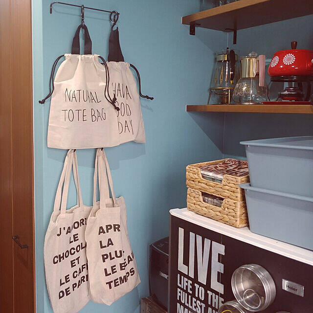 tomokomoさんは、ダイソーのトートバッグを使って、ゴミ袋の指定席を設けていました。ごみ箱にセットしておくことで、ゴミ捨てや袋の交換がスムーズになりますね。シンプルなのに個性のあるデザインで、ほどよいアクセントにもなっています。