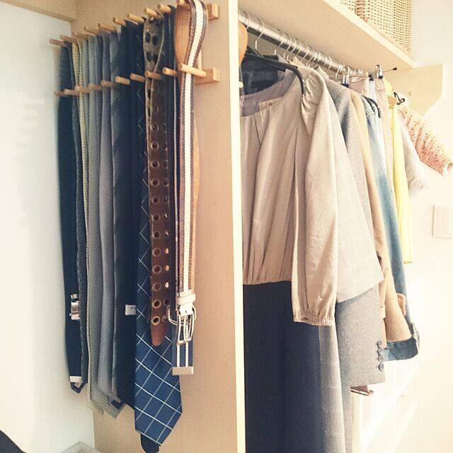 クローゼットの壁にタオルハンガーを取り付けて、ネクタイとベルトの収納スペースを作っています。バーに引っ掛けるだけの収納なので、ストレスフリーで出し入れができますね。かさばりがちなネクタイとベルトをセットで、省スペースに整理整頓ができる快適な方法です。