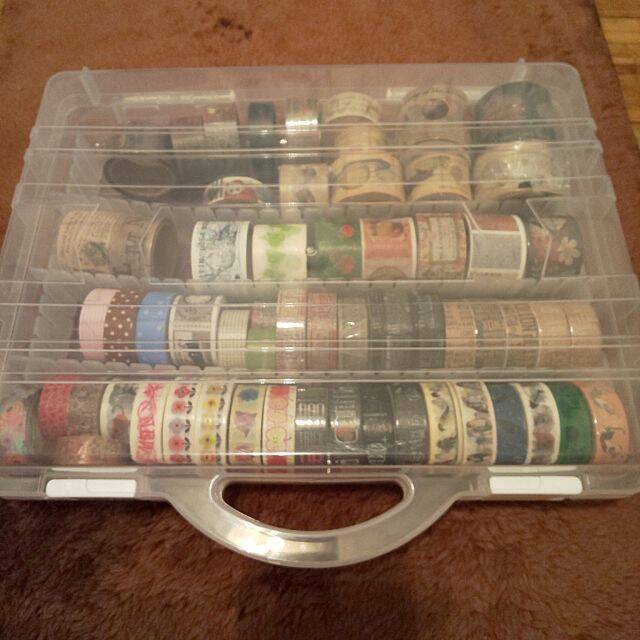 ダイソーの持ち手つきケースに、マスキングテープを収納している実例です。透明のケースに入れると、ケースを開けることなく中身の確認ができるので便利ですね。ホコリも気にならないので、衛生面でも安心です。