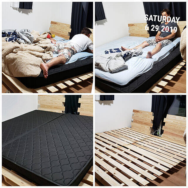 こちらのユーザーさんは、シングルとダブルのマットレスがずれないように、ベッドの枠をDIYされました。こうすることで、一つのベッドとしてより安定するのがいいですね。マットレスを並べたときに隙間が気になる、という方はぜひ参考にしてみてはいかがでしょうか。