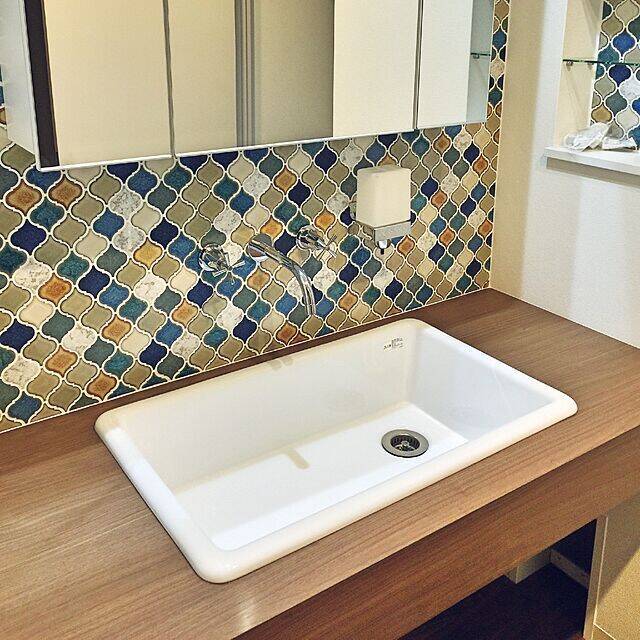 ミラーの固定された壁にモザイクタイルを貼っている実例です。洗面台は木を土台にしていて、モザイクタイルとの組み合わせにセンスの高さがうかがえますね。表面には物を置いておらず、モデルルームのような風情です。