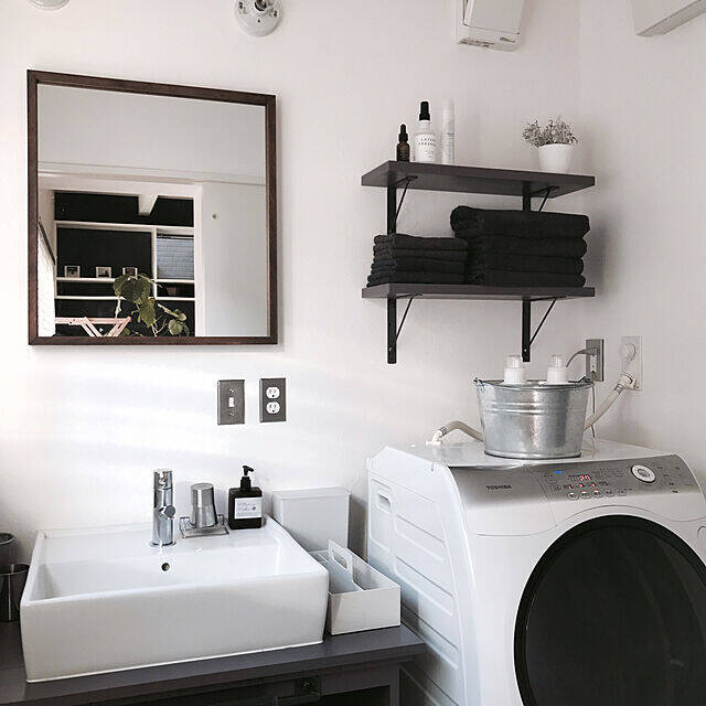 濃い色のウォールシェルフにタオル、洗面台にホワイトの壁、洗濯機、洗面ボウルを組み合わせたシックな印象のお部屋です。モダンな雰囲気がたまりませんね。洗面台の表面には最低限のアイテムだけが置かれており、ブラックのボトルでクールさに磨きがかかっています。