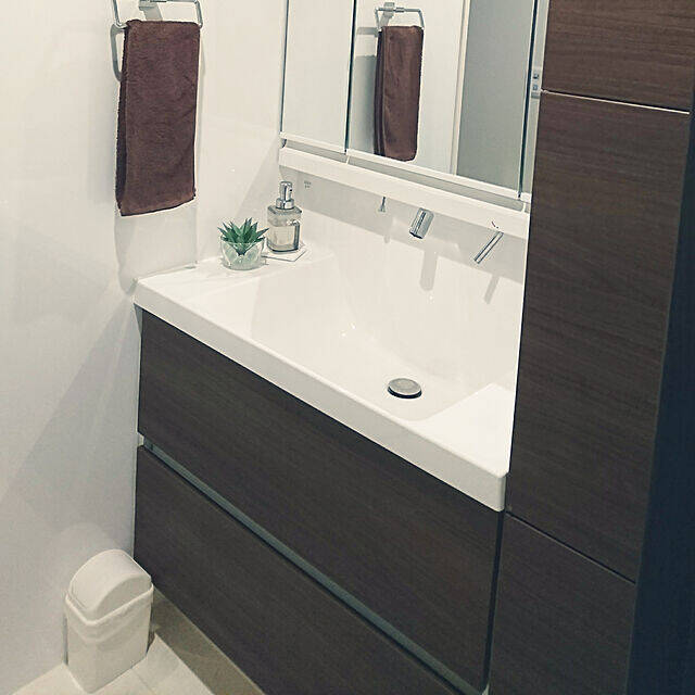 続いては、ダークブラウンの壁紙やタオルでホテルライクな空間をつくりあげているユーザーさんです。洗面台にはシルバーのボトルでコンパクトなグリーンだけが置かれていて、落ち着いた雰囲気の中にさりげないポイントがあるのがおしゃれ。とてもピカピカで素敵ですね。