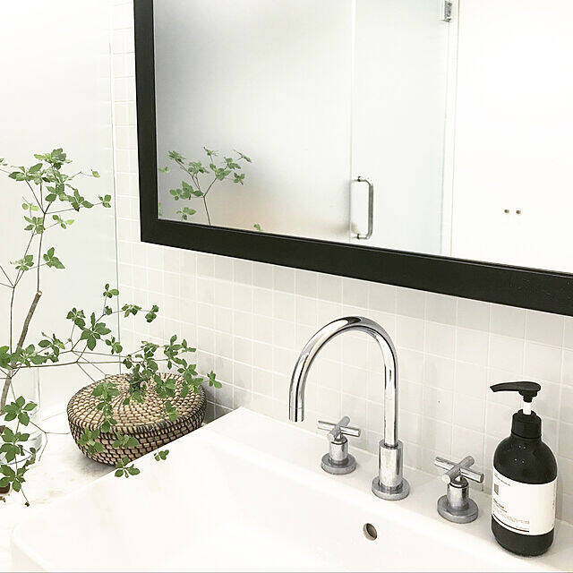 ホワイトの洗面台・壁紙に、ブラックのミラーフレーム・ボトルでコーディネートされた実例です。洗面台の左側には蓋つきのバスケットにグリーンがそえられていますね。ホワイト×グリーンで魅力満点の塩系インテリアが完成しています。