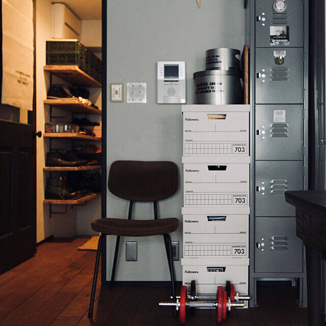 こちらのユーザーさんは、4つのバンカーズボックスを縦に積み上げて使われています。隣に並んだロッカーや、重ねて置いたメタリックな収納ケースなど、インダストリアルテイストでカッコよくまとめられていますよね。ロッカーやチェアと高低差を付けたことで空間に圧迫感もなく、それでいてたっぷりと収納できそうです。