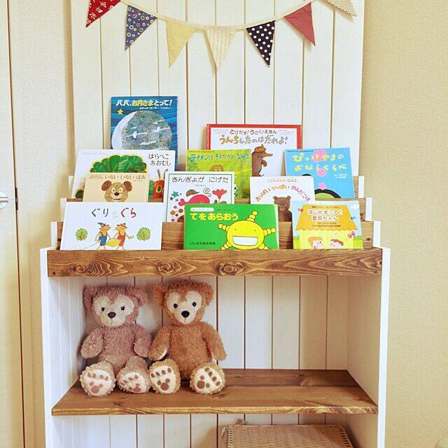 小さなお子さんがいるお家にぴったりなのが絵本棚です。こちらのユーザーさんは、絵本棚の下にぬいぐるみの収納スペースも確保し、お子さんのおもちゃも置けるよう工夫されています。絵本の表紙はかわいいものが多いので、お部屋が明るくなりますね。
