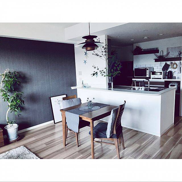 chocoさんは、ダイニングテーブルをキッチンの横に並べるようにして配置しています。料理の配膳だけでなく、食事中に使う調味料の出し入れなども楽にできそうですね。また、片側にL字型のソファを置いているので、お友達が来た時でもゆったりとくつろげそうです!