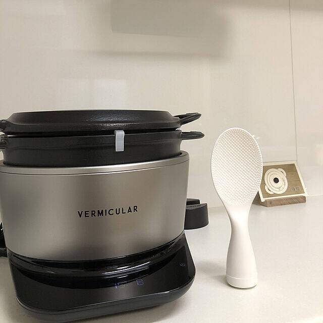 安定感のある立ち姿の、白いしゃもじ。nikoさんによると、下におもりが付いていて、倒れにくいそうです。ごくシンプルなしゃもじは、デザイン性の高いバーミキュラのライスポットに、よく似合っています。