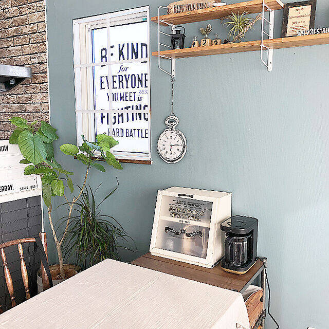 ダイニングテーブルには、コーヒーマシンと並べたショーケースがよくお似合いです。中には、コーヒーカップやコーヒー豆が入っているんだそう。手作りされたショーケースは、サイズ感も絶妙ですよ。コーヒータイムが快適になり、気分もワンランクアップしてくれます。