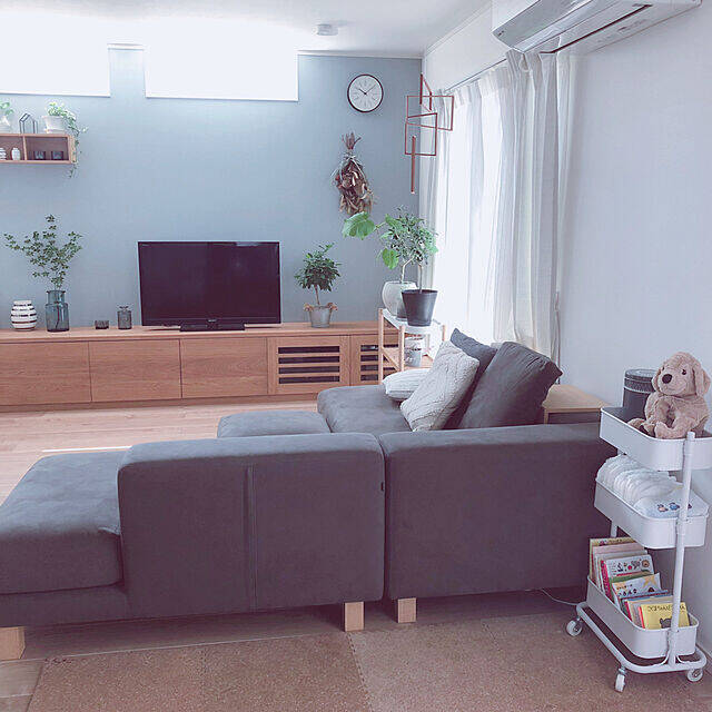 こちらのユーザーさんは、壁際のミラー横に大きな観葉植物を置いています。木目の印象的なフロアで、木のぬくもりが感じられるお部屋なので、大きなグリーンもよく馴染みますね♡テレビ横などに置かれた小さなグリーンたちもかわいいです。