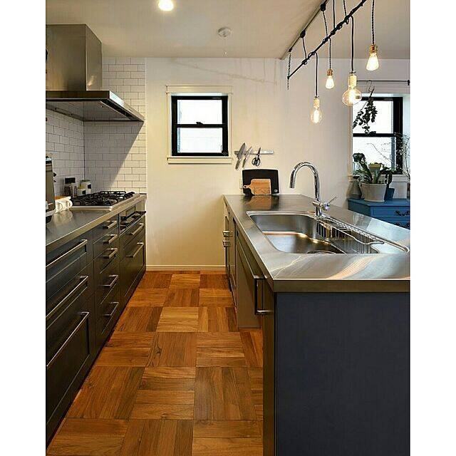 対面式のキッチンですが、こちらのタイプはII型と言われるタイプで、シンク部分だけがダイニングに向いており、ガス台は壁側を向いています。グレーの収納とステンレスの調理台がスッキリとして見えます。この色はキッチン購入後にユーザーさんが好みの色に塗装してもらったそう。白い壁に黒い窓枠がとても合っています。