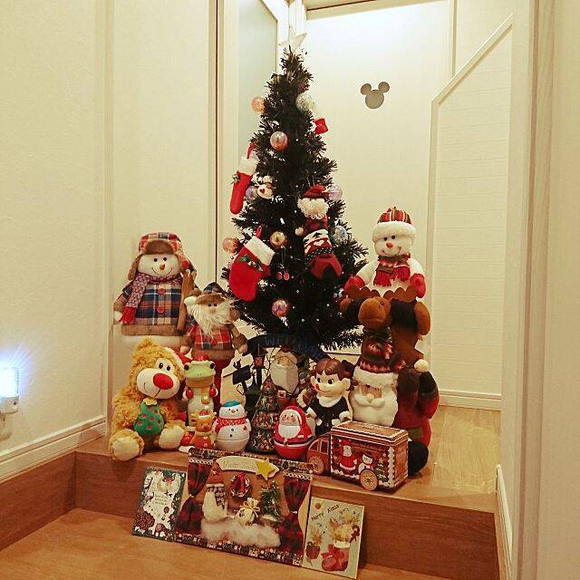 corocoro.manmaruさん宅のクリスマスツリーは、たくさんのキャラクターとともにディスプレイされています。オーナメントの赤い靴下がアクセントになっていて、ポップで楽しい雰囲気が伝わる実例です。