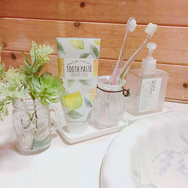 洗面所に置かれた瓶に、さりげなく飾られたダイソーのフェイクグリーン。本数を少なめに余裕を持って瓶にさしてあるため、すっきりと爽やかな印象を受けますね。隣に置いてある、ユーザーさんが作られた歯磨き粉カバーとの相性も◎です。