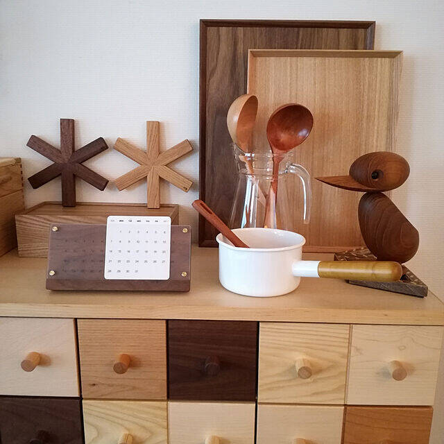 RAMIEさんは、木製の鍋敷きやコースターとSTUIO M'のホーローミルクパンを並べていらっしゃいましたよ♪テーブルに出すときは、木製のテーブルウェアと組み合わせると温かみのあるコーディネートができます。ホワイトベースのお鍋のフチと取っ手部分のカラーは、ブラウンとサックスから選べるようですよ。