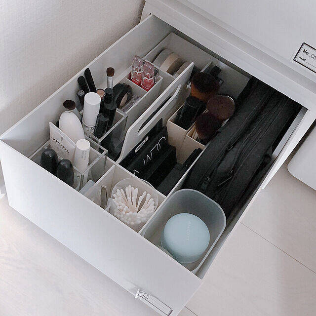 こちらのユーザーさんは無印良品のキャリー型の収納ケースを引き出しの中に入れています。部屋が6つに別れており、その中にさらにケースを入れて小さく仕切っています。化粧品は立てることで見やすくなり、どこに何があるのか一目瞭然で使いやすそうです。キャリー型なので、持ち出して使うこともできて便利ですね。