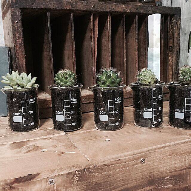 小さな可愛らしいサボテンを、キャンドゥのビーカーに植えています。シンプルなデザインのビーカーに植えると、サボテンのグリーンが鮮やかに映えますね♪白地の目盛りがいいアクセントにもなっています。きちんと一列に並んだサボテンがなんとも愛らしく、つい眺めていたくなるような光景です。