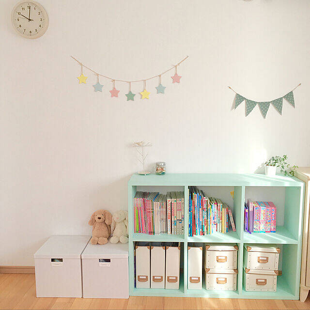 パステルグリーンの棚が印象的なこちらの子ども部屋。元々は茶色だった棚を、ユーザーさんが子ども部屋に合うようにペンキで塗ったのだそうです。グリーンを中心にさわやかな色あいにまとまっています。カラフルなガーランドが、かわいらしさをアップしていますね。